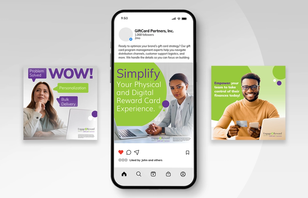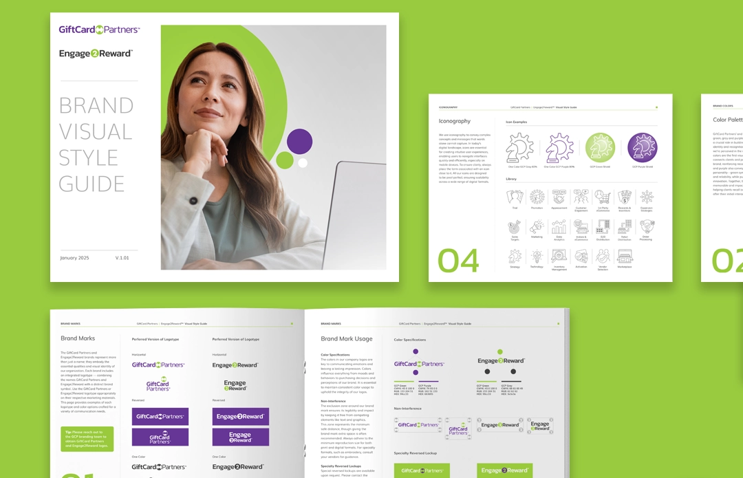 I led the brand redesign for GiftCard Partners and their Engage2Reward product, ensuring alignment with the company’s vision and goals. I created updated logotypes to establish a modern, consistent look across all brand assets. I also managed the development of PowerPoint templates, sales materials, social media assets, and user guides. To maintain consistency, I developed a comprehensive brand style guide, elevating the brand across all touchpoints.